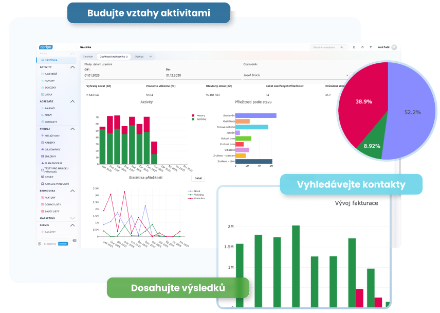 CORIPO spolupracuje s mnoha partnerskými aplikacemi, které vám pomohou rozšířit možnosti CRM a zvýšit produktivitu. Všechny integrace jsou snadno konfigurovatelné. Potřebujete si sami připojit libovolný externí systém? Máme pro vás připravenu komplexní API platformou.